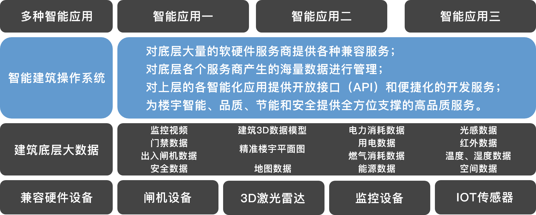 智能建筑操作系统可以深度适配各类智慧园区与智能建筑(产业园、写字楼、酒店、商场和智慧粮仓等场景)。针对智能建筑内的硬件、软件等各类资源提供安全的物联、管理和数字服务,从底层打通各类管理及用户服务业务模块,为业主、物业、用户提供安全、高效、便利的智能建筑综合管理。智能建筑操作系统支持不同楼宇之间的互联互通,提供对智慧园区和智慧城市(多楼宇集群联网模式)的进一步支撑。该智能建筑操作系统拥有独立自主知识产权,对国家安全、行业进步、企业发展有着重要意义。