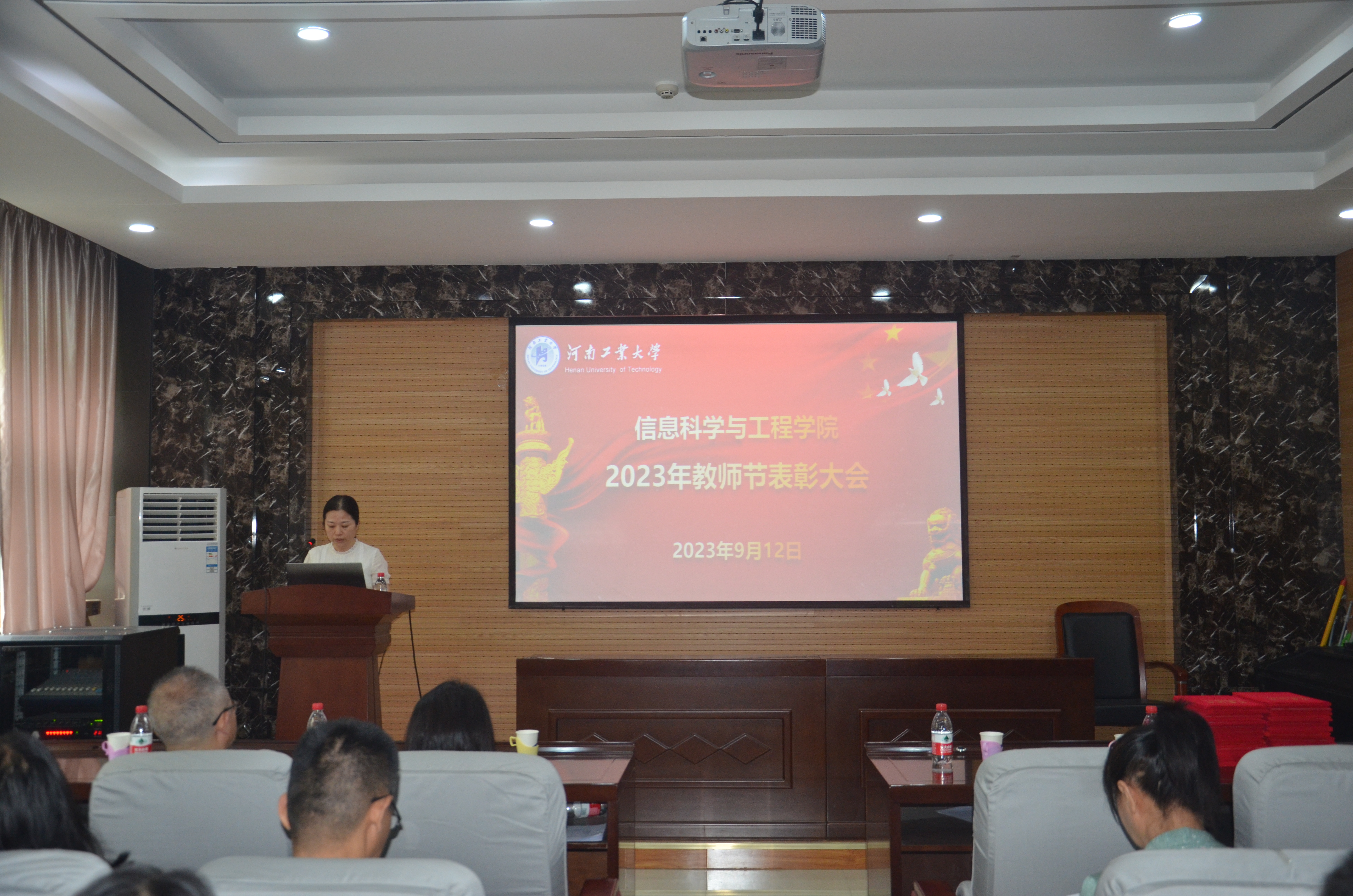 在6228会议室举行庆祝第39个教师节表彰大会,大会以“躬耕教坛,强国有我”为主题。学院领导班子和全体老师参加会议,会议由学院党委书记郭晓旻主持。