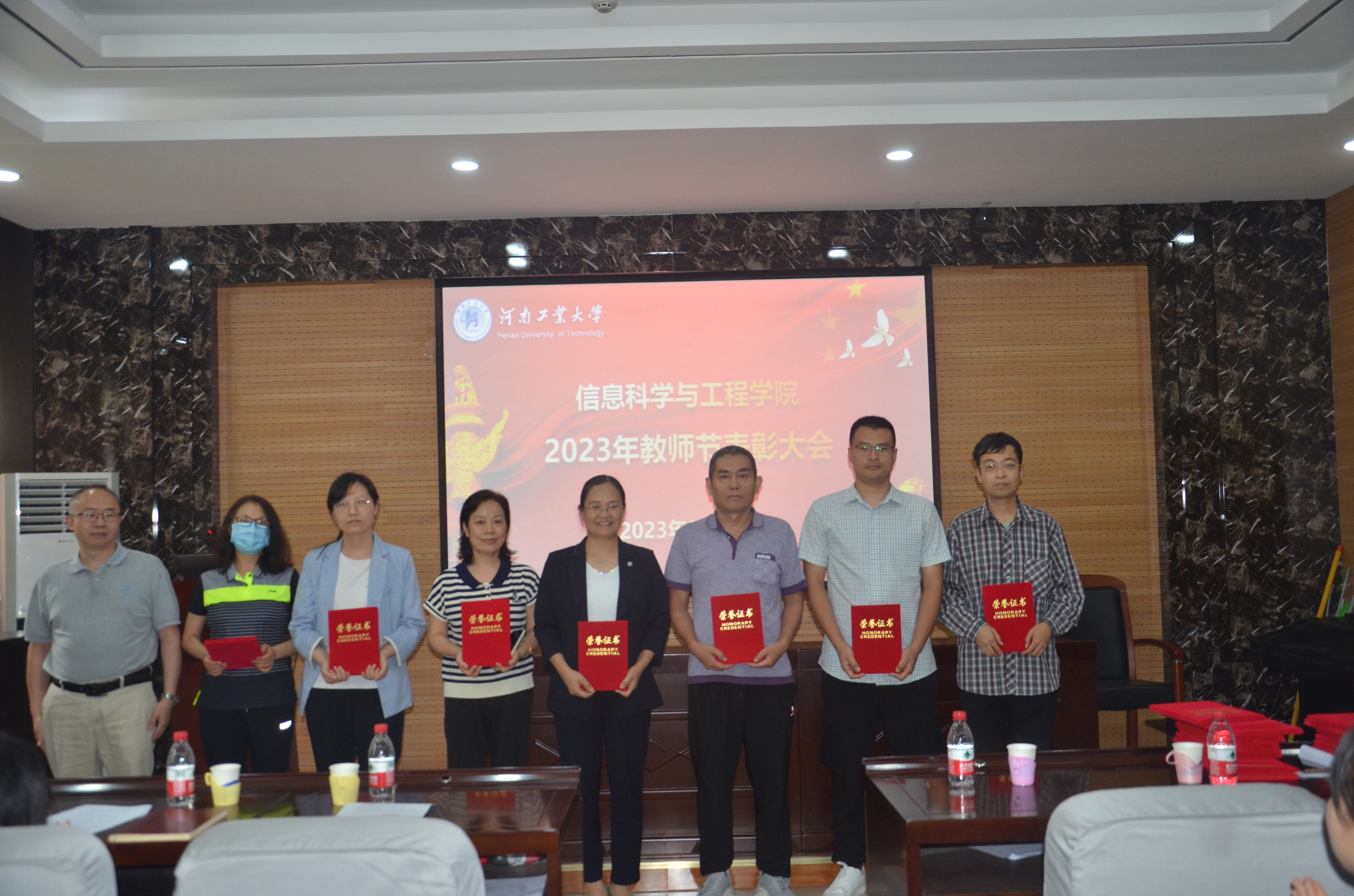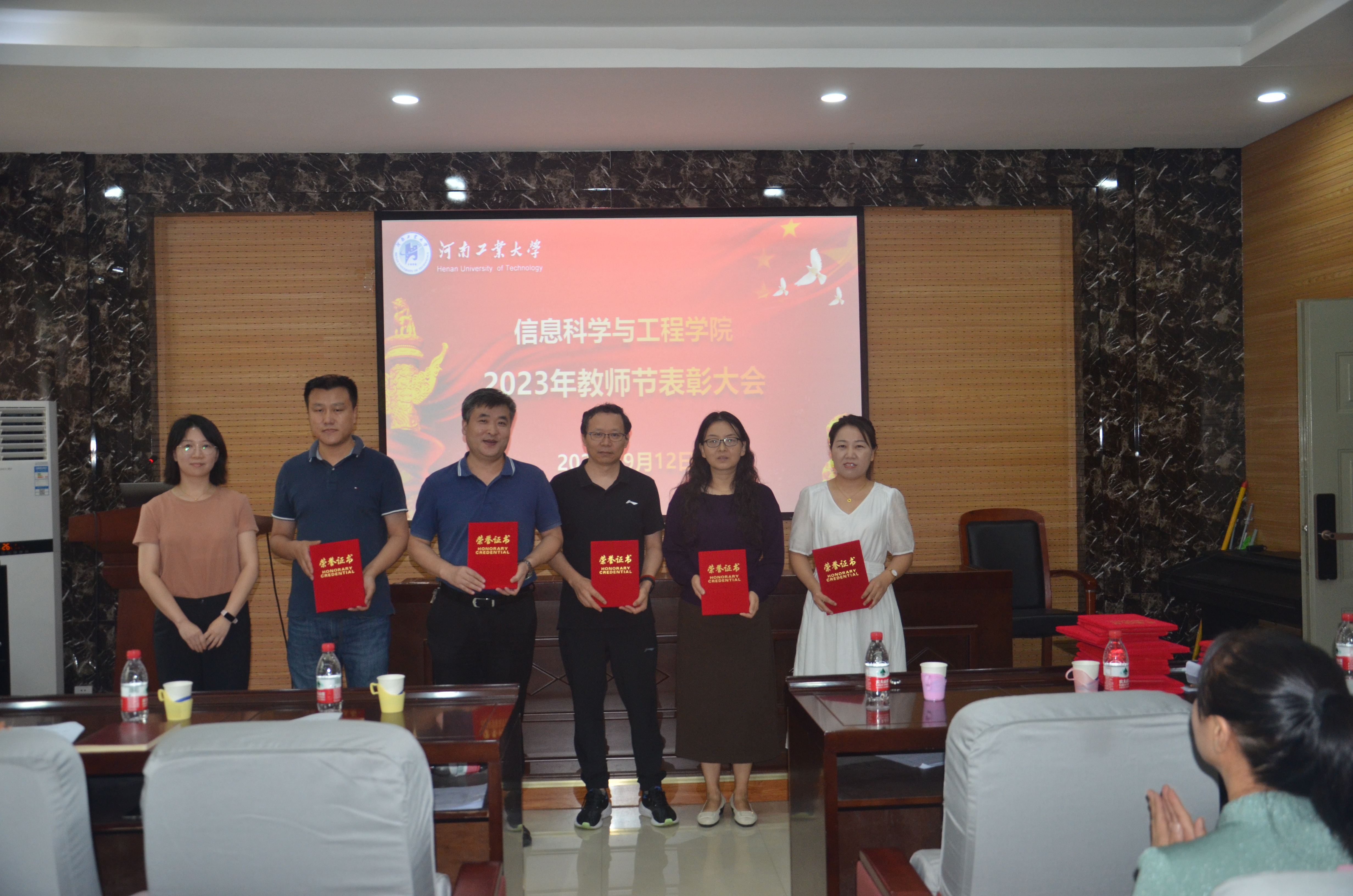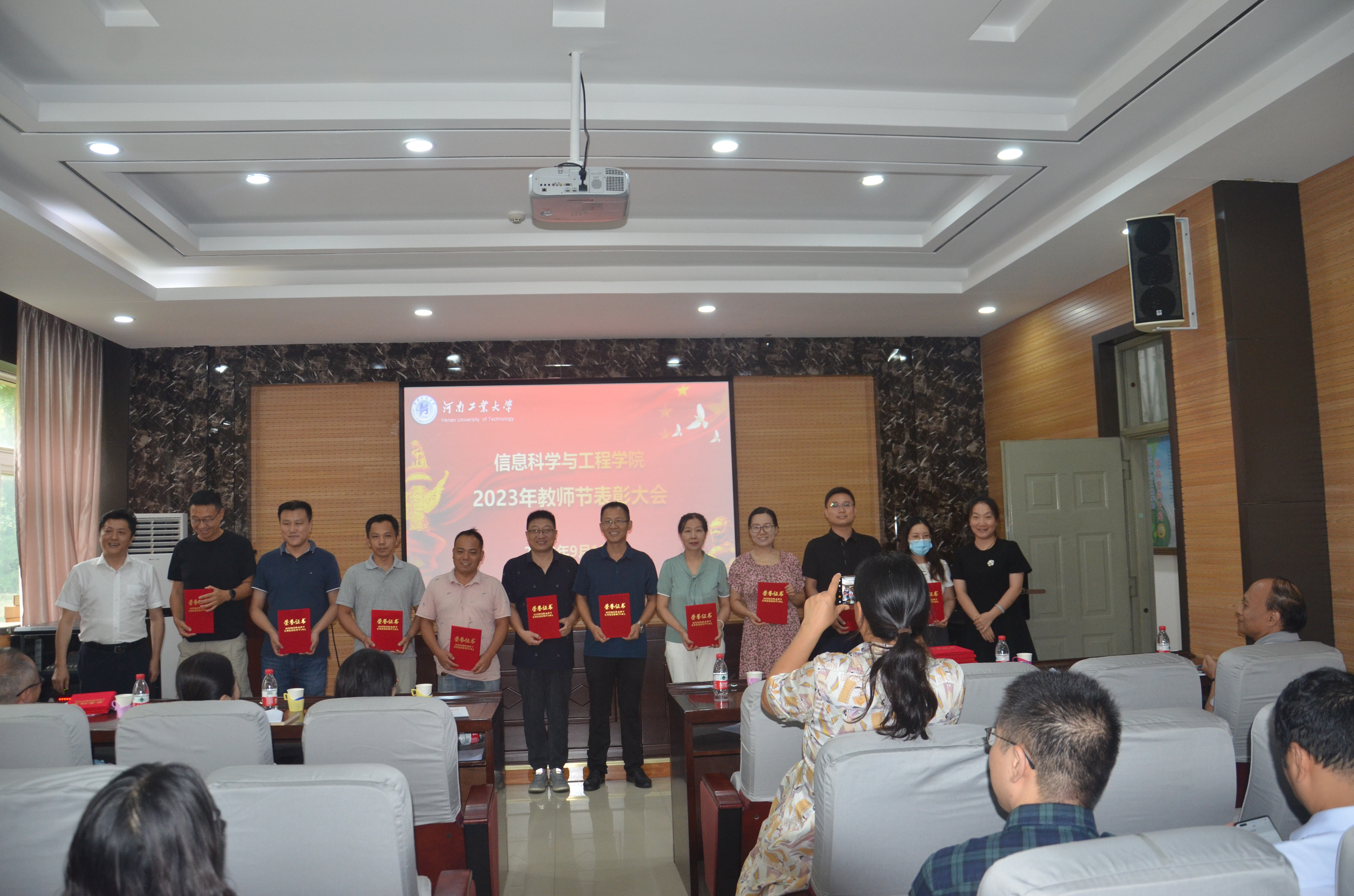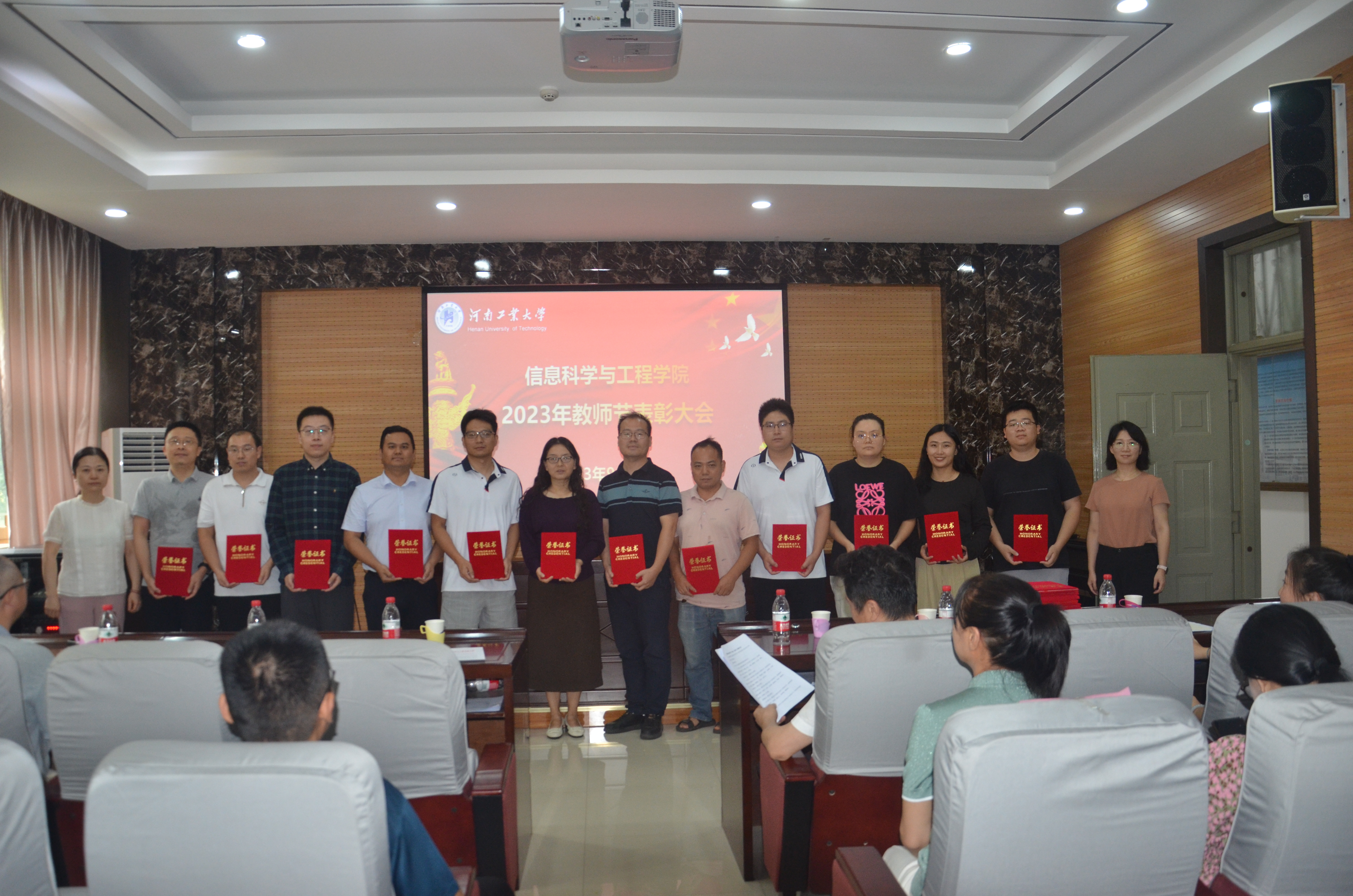 《关于表彰2022-2023年度先进教师的决定》,隆重表彰过去一年在党建、教学、科研、学生管理和工会工作中涌现出来的先进个人。与会院领导郭晓旻、孙丽君、傅洪亮、秦瑶、刘宏月分别颁发荣誉证书,并与获奖者合影留念。