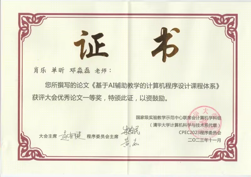 肖乐老师(一作)、单昕(研究生)和邓淼磊老师(通讯作者)共同撰写的论文《基于AI辅助教学的计算机程序设计课程体系》在本次会议中被评选为一等奖,并受邀在会议论坛作论文报告。