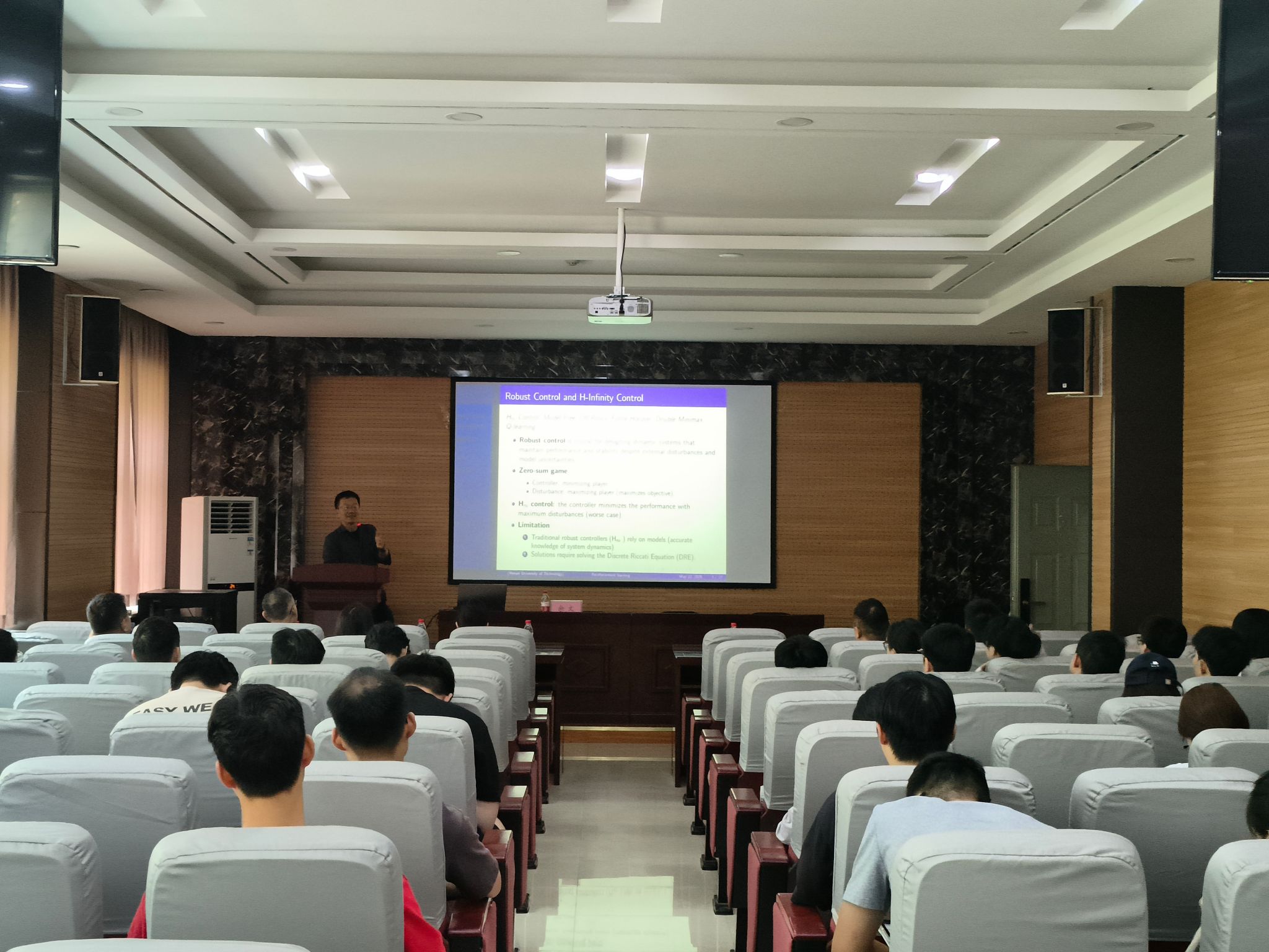 在报告中,Wen Yu院士以“有限时域H∞控制”为切入点,深入剖析了其在鲁棒系统设计中保障特定时间区间性能的重要性。针对传统基于模型方法因差分Riccati方程时变特性在应对未知动态系统时面临的重大挑战,Wen Yu院士重点介绍了基于距离策略强化学习的模型无关方法。通过神经网络双重极小极大Q学习,创新性解决了控制与干扰间的对抗优化难题。报告深入展示了算法的严谨收敛性证明及在复杂未知动态环境下的卓越性能表现,揭示了其在智能控制领域广阔的应用前景。