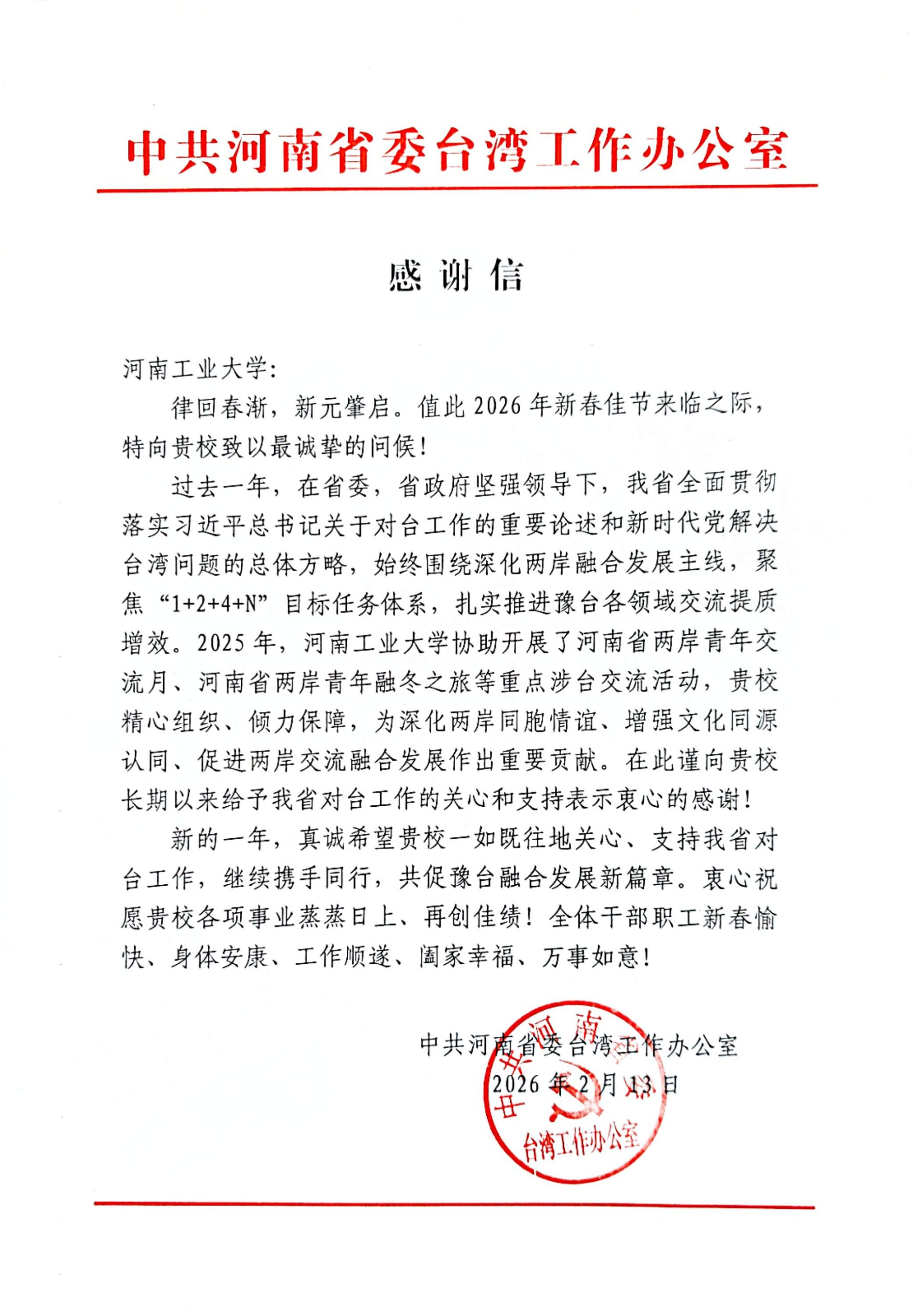 感谢信中指出,河南工业大学作为河南省高等教育的重要力量,在深化两岸同胞情谊、增强文化同源认同、促进两岸交流融合发展持续发挥积极作用,为河南省对台工作提供了有力支持。