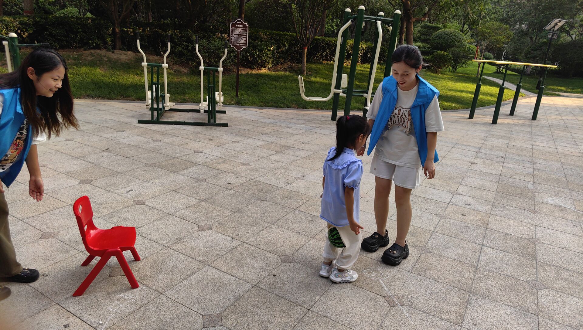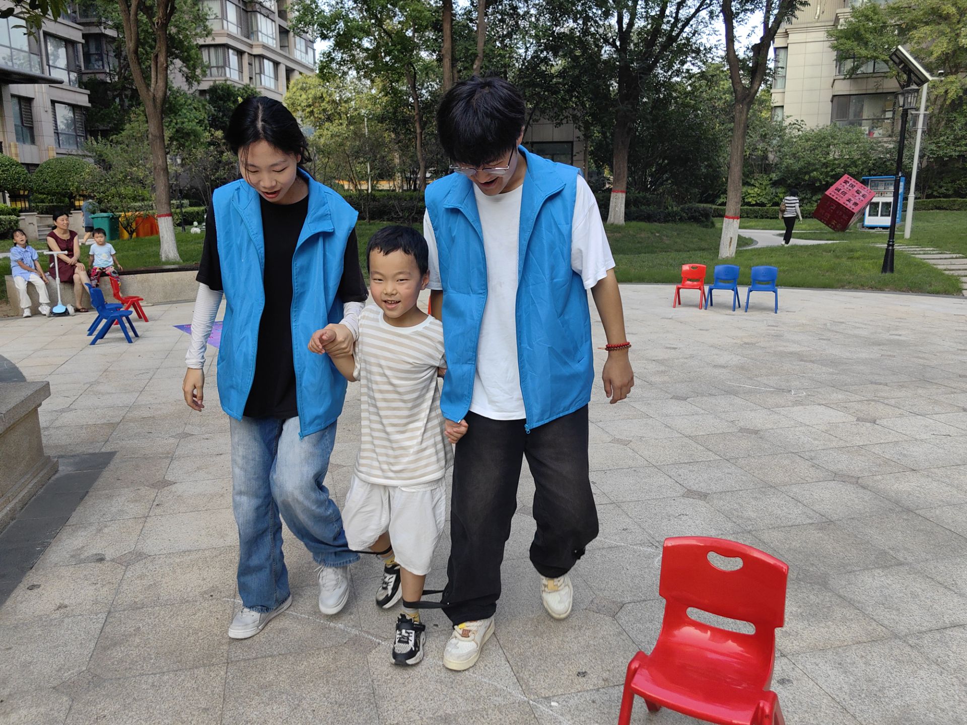 活动的第一个项目是三人四足,这次是由两个志愿者搭配一个孩子志愿者在外面确保孩子安全,保证孩子不会摔倒,比拼采用一组一组记时的形式。