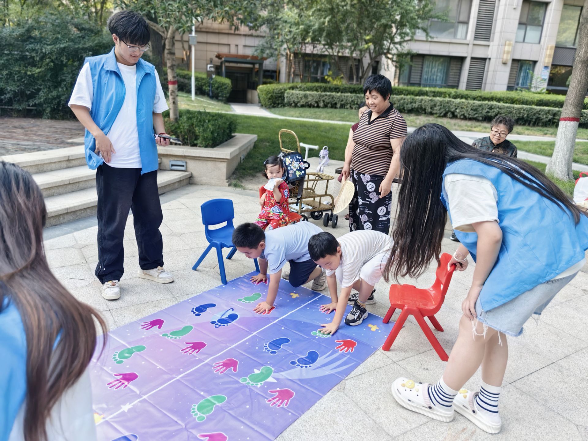 最后一个比赛项目是手忙脚乱,孩子需要踩或者用手触摸特制垫子上的手和脚的形状,将孩子分为两组同时进行,用时最少的孩子一组获胜。