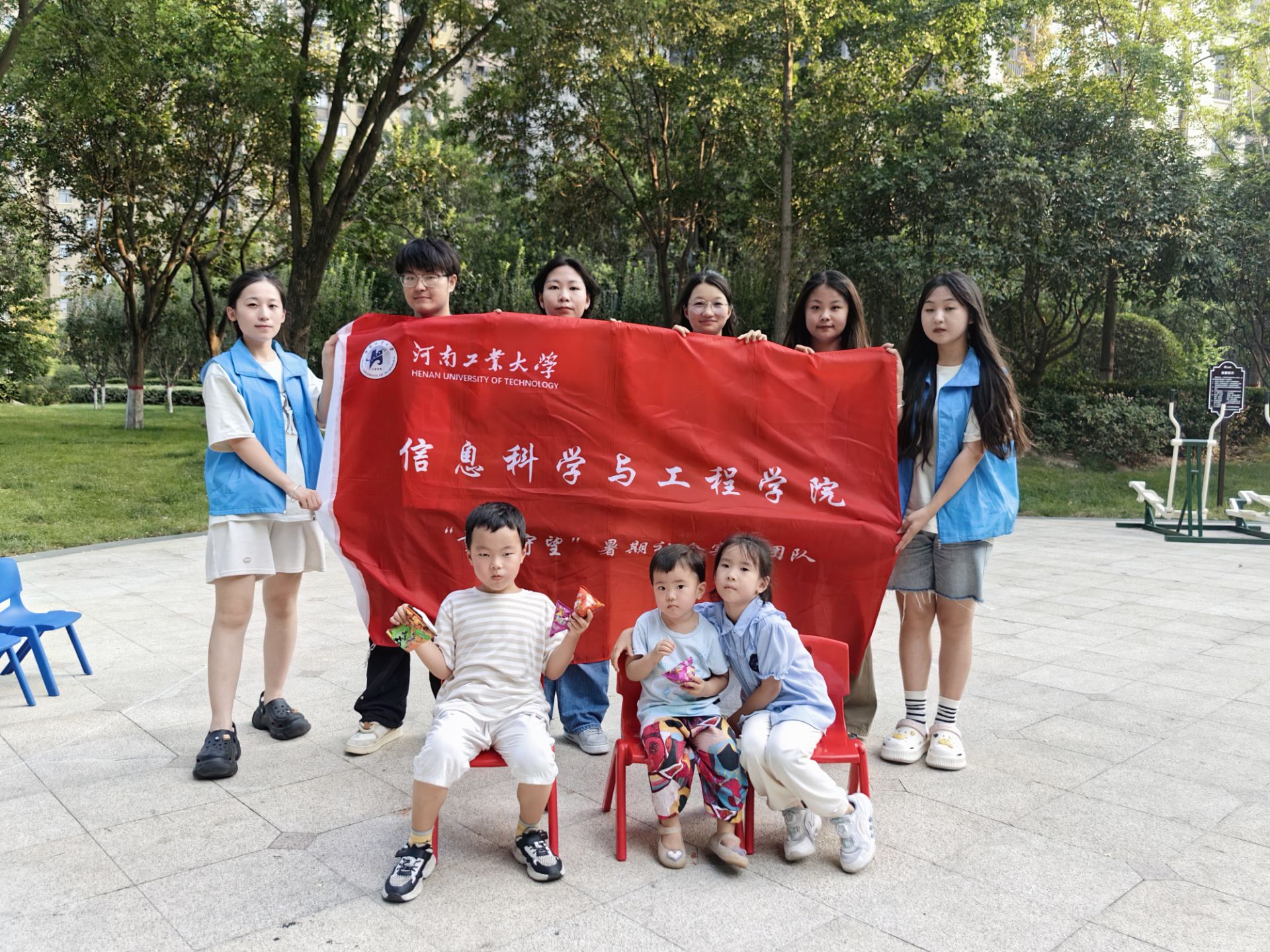 在这次活动的最后,实践团队的成员拿出院旗与孩子们合照,孩子们和志愿者一同度过了快乐的一天。活动圆满完成,志愿者们收拾了物品和现场与孩子们依依不舍地道别。