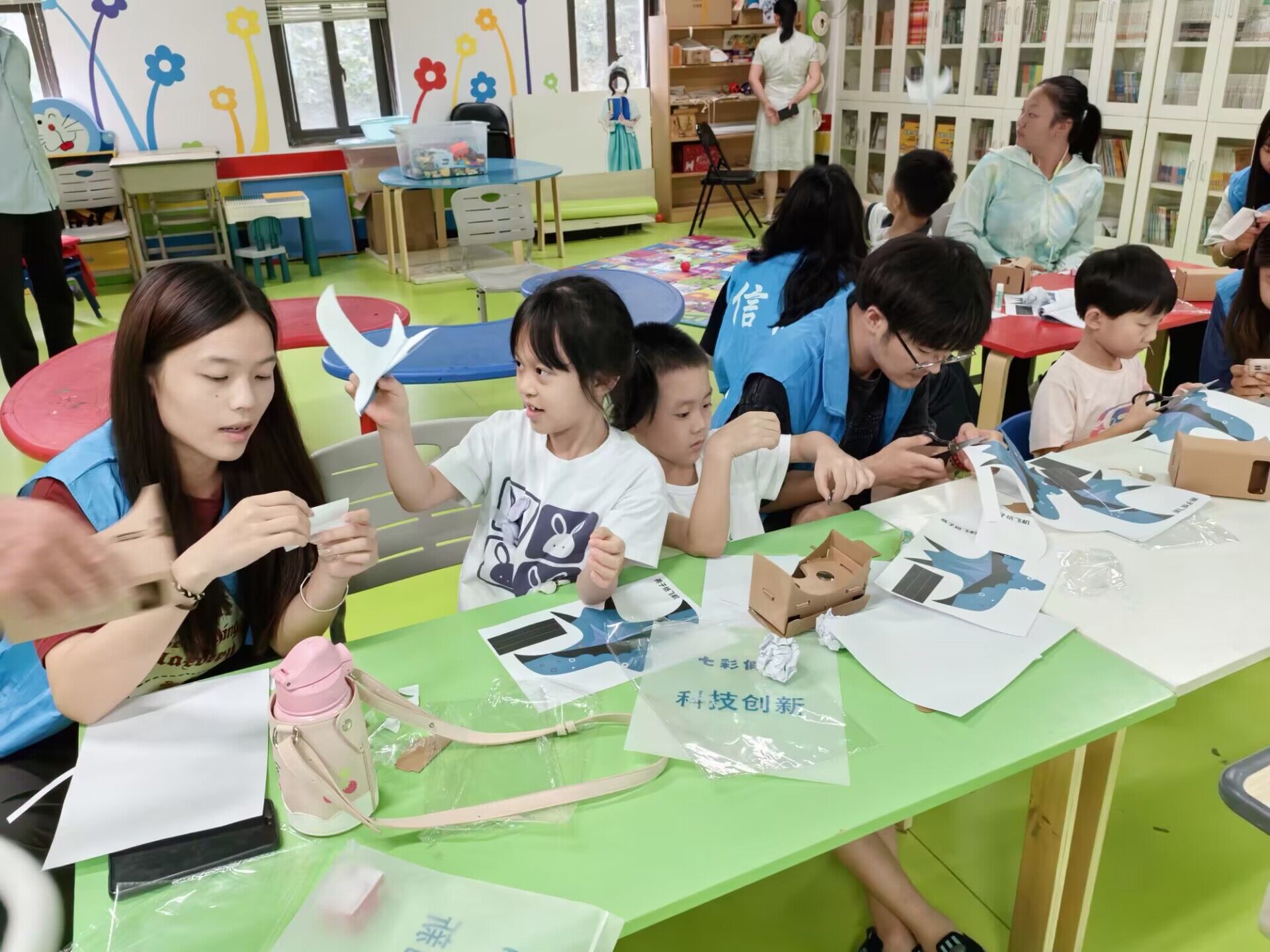 在童心守望队的队员的指导下,孩子们学会了调整折叠的角度和精确扔掷的技巧,使他们的纸飞机在空中翱翔。此次VR眼镜和纸飞机的实践活动不仅让社区儿童亲身体验到了科技的魅力,还启发了他们对于科学与创造力的兴趣。这样的社区活动为孩子们提供了一个积极、有趣和互动的学习环境,激发了他们的好奇心和想象力。