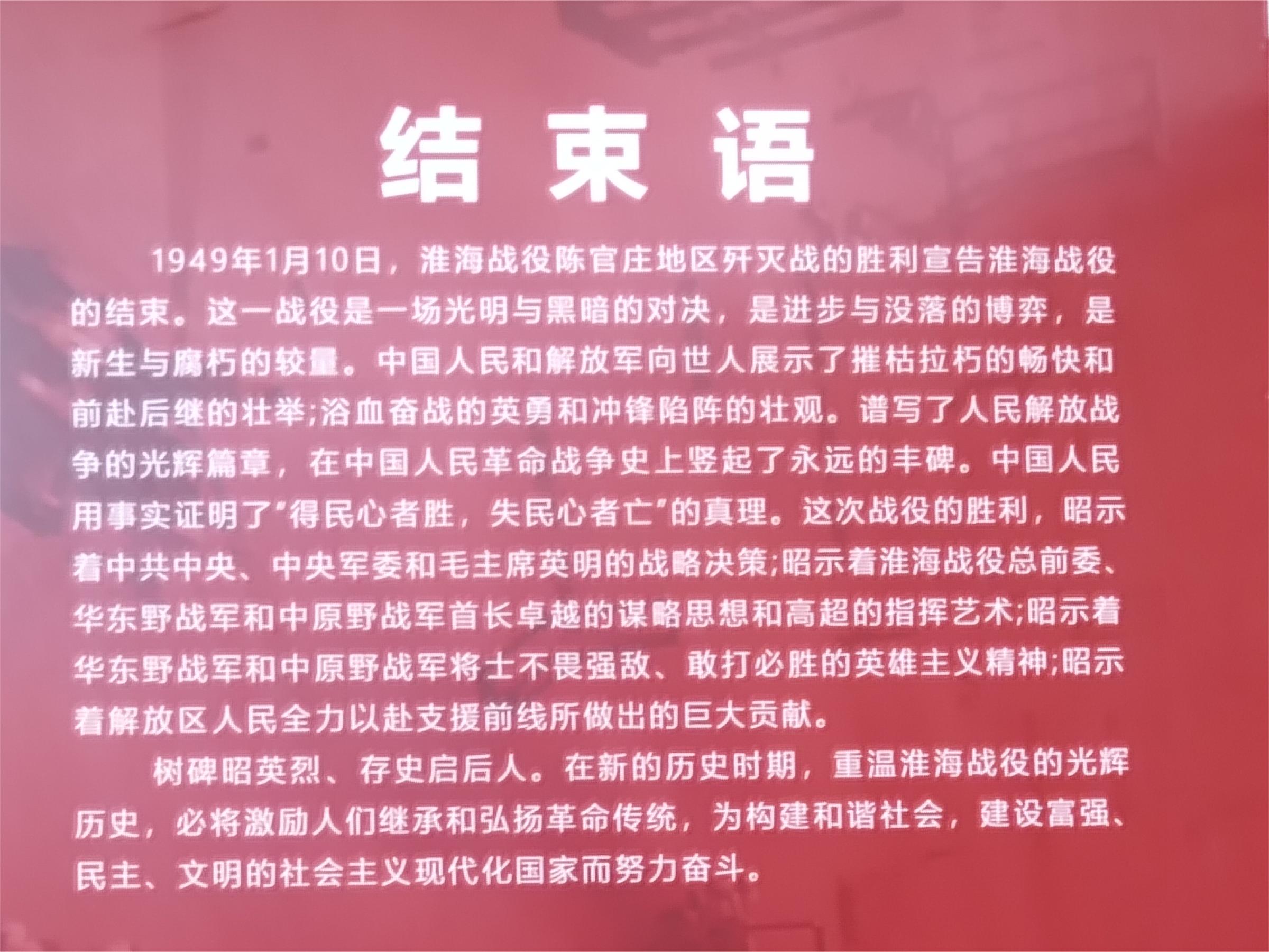 下午5点左右,纪念馆的参观进入尾声,馆后结束语也令人动容。淮海战役是一场明与黑暗的对决,是进步与没落的博弈,是新生与腐朽的较量。中国人民和解放军向世人展示了摧枯拉朽的畅快和前仆后继的壮举;浴血奋战的英勇和冲锋陷阵的壮观。从纪念馆中走出,队员们的心仍停留在馆内所记录的淮海战役历史中。