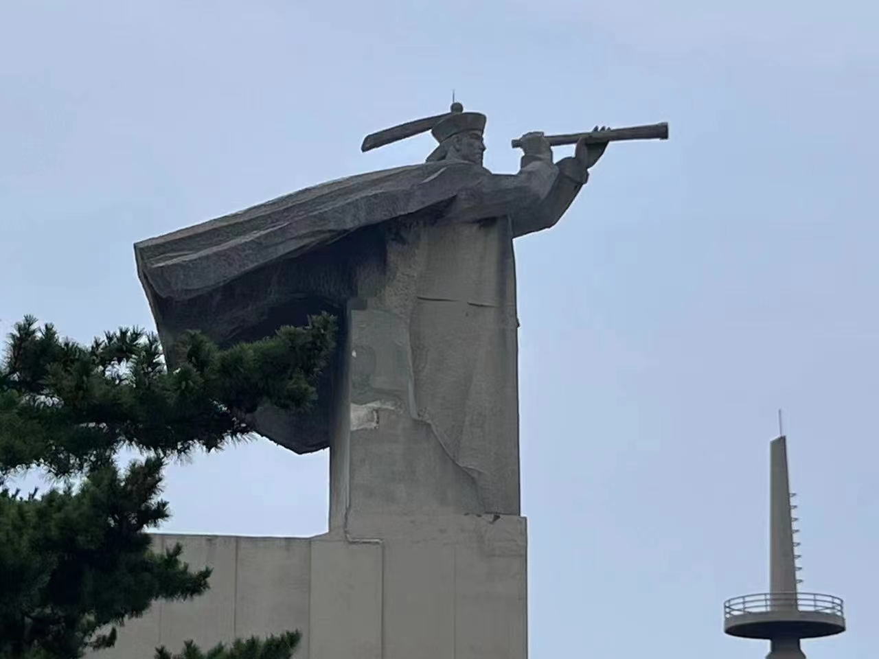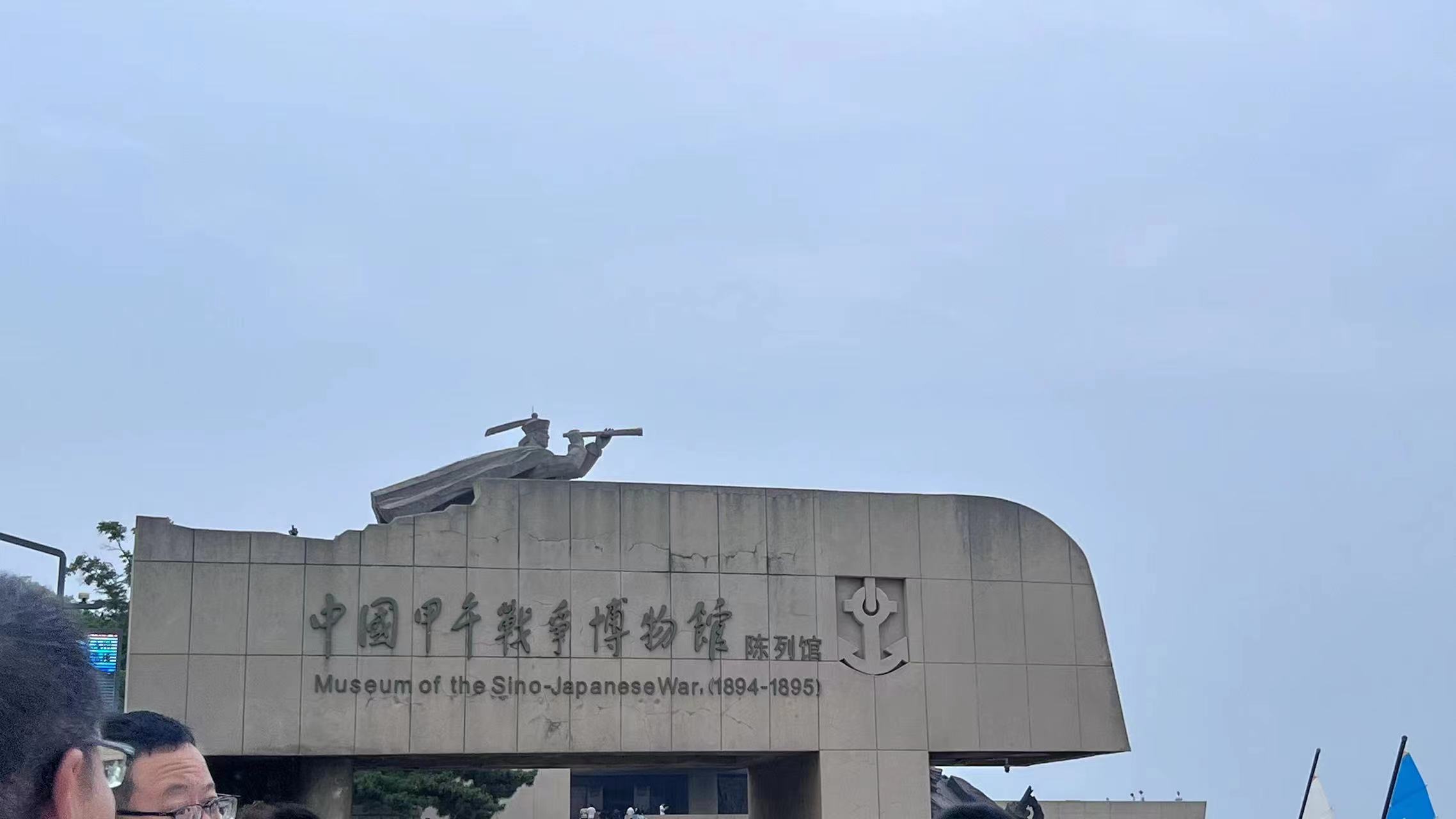 上午8点整,团队首先来到中国甲午战争博物馆门口,石碑上刻着甲午战争的历史时间。博物馆建筑的造型像一艘战舰,民族英雄邓世昌的石像挺立在甲板上,他手里拿着望远镜,双目炯炯有神地注视着前方,好像是在观察着敌情,抑或是思考着退敌战略。