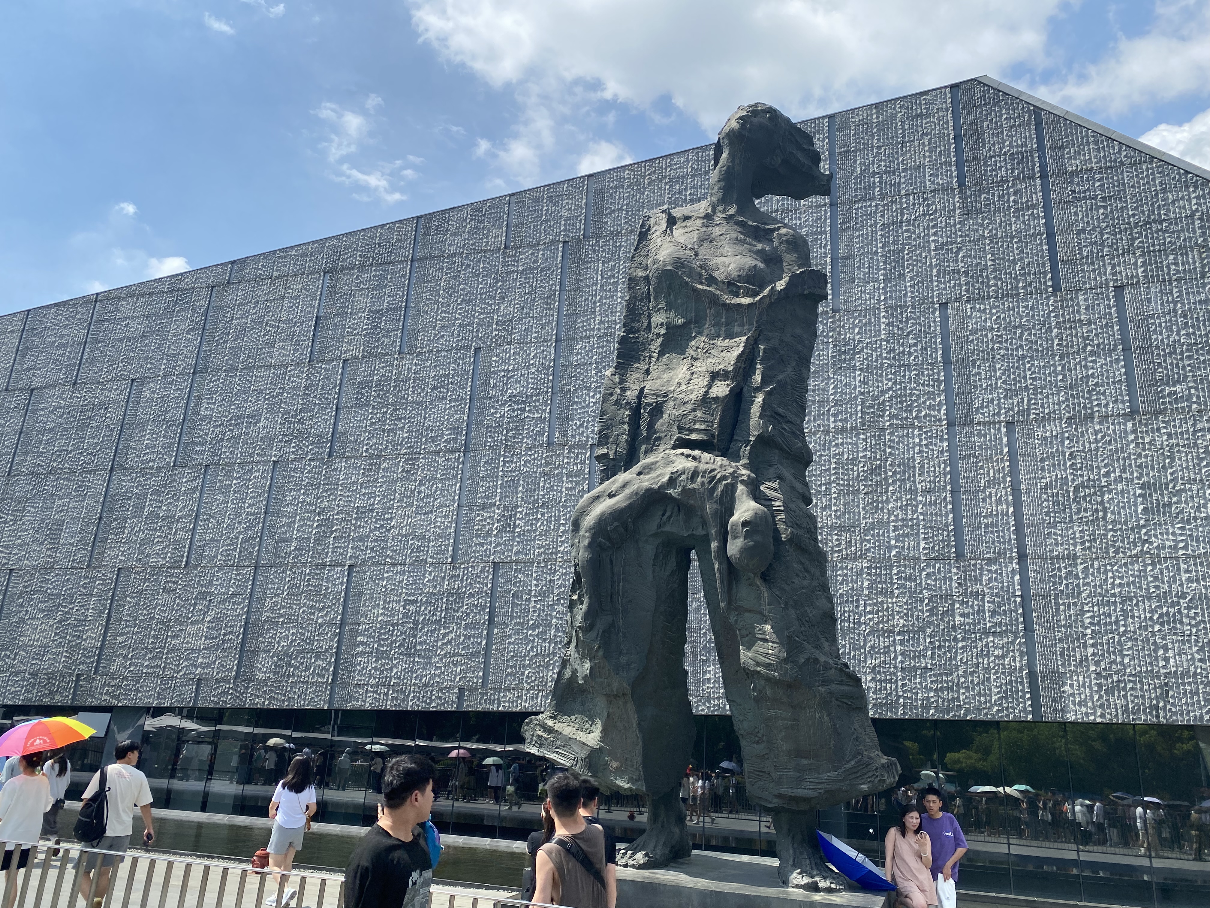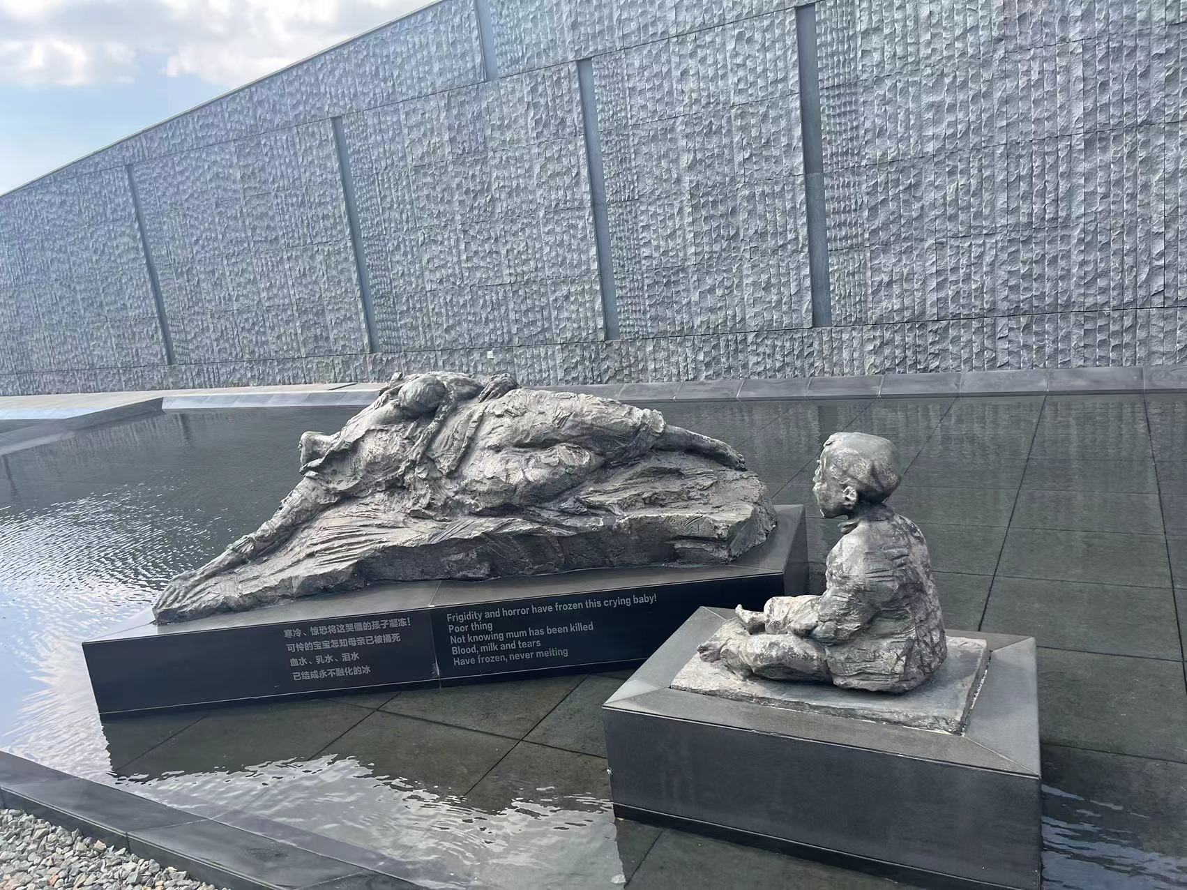 接着向前走,是一排排在水中的雕塑群。该雕塑群刻画了当时南京人民在侵华日军惨无人道的屠杀下逃难的情形,这些雕塑有年过花甲的老人,有尚在襁褓中的幼儿,有相携的伴侣,但是她们都只有一个一直的动作:奔跑!逃!