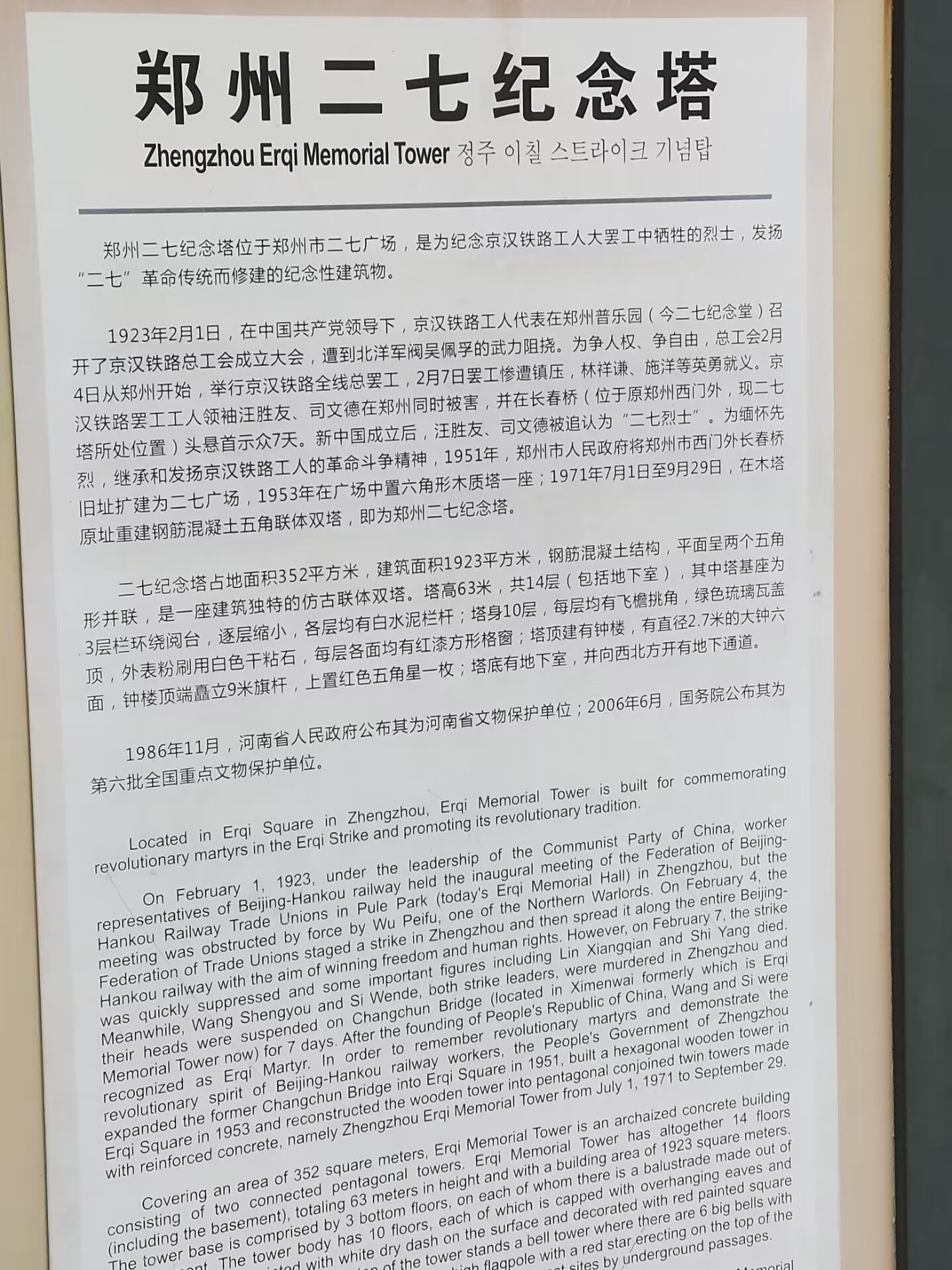 郑州二七纪念塔位于郑州市二七广场,是为纪念二七工人大罢工而建。郑州二七纪念塔为双身并联式塔身,塔全高63米,共14层,其中塔基座为3层,塔身为11层。每层顶角为仿古挑角飞檐,绿色琉璃瓦覆顶。塔顶建有钟楼,六面直径2.7米的大钟,整点报时演奏《东方红》乐曲。钟楼上高矗一枚红五星。二七纪念馆内共有10个塔层层厅和1个地下层厅,塔内陈列有“二七”大罢工的各种历史文物、图片、文字资料。“寻迹红色记忆”实践团成员来到二七塔脚下“学党史,悟思想,办实事,开新局”的党史学习教育展厅,通过厅内的影视、文字资料了解到二七大罢工工人阶级的英勇事迹,二七塔的今昔变革,郑州这座城市的城市记忆以及民众对于工人运动永恒的纪念。