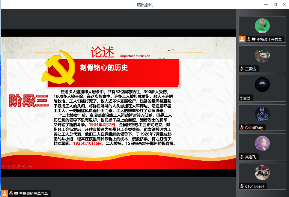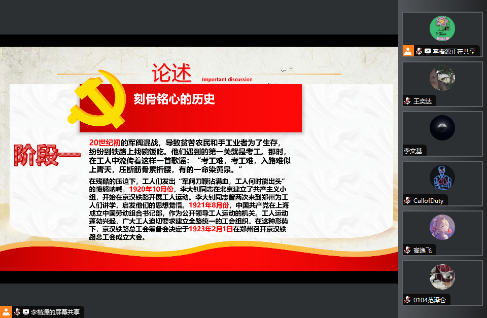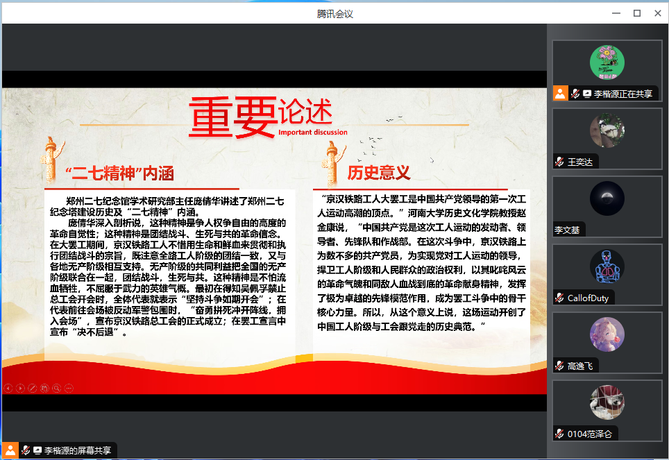 当天下午7时30分,队长组织在腾讯会议进行直播,通过ppt的形式进行理论知识的加深活动。7时30分至8时30分重点讲述了新中国成立之初的二七纪念塔。第一部分为一段刻骨铭心的历史,从“20世纪初的军阀混战,导致贫苦农民和手工业者为了生存,纷纷到铁路上找碗饭吃。”的背景开始,讲述了二七纪念塔建造的背景与当时的时代氛围,刻骨铭心的历史令人久久不能释怀;第二部分为一种生死与共的革命信念,分别解析了二七精神的具体内涵与历史意义这种精神是争人权争自由的高度的革命自觉性;这种精神是团结战斗、生死与共的革命信念。这场运动开创了中国工人阶级与工会跟党走的历史典范。第三部分是一次次绽放时代的光芒,讲述了二七塔的成就与对当代青年具有非同凡响的意义;二七精神也在历史的长河中不断符合着最新的价值观,与国家发展高度契合。郑州二七纪念塔自诞生之日起就带着历史的记忆,镌刻着红色的基因,自1971年落成以来,它就像一位岁月老人,见证着郑州这座城市的发展与变迁,而其所代表的“二七精神”,也在一代代郑州人中延续和传承。