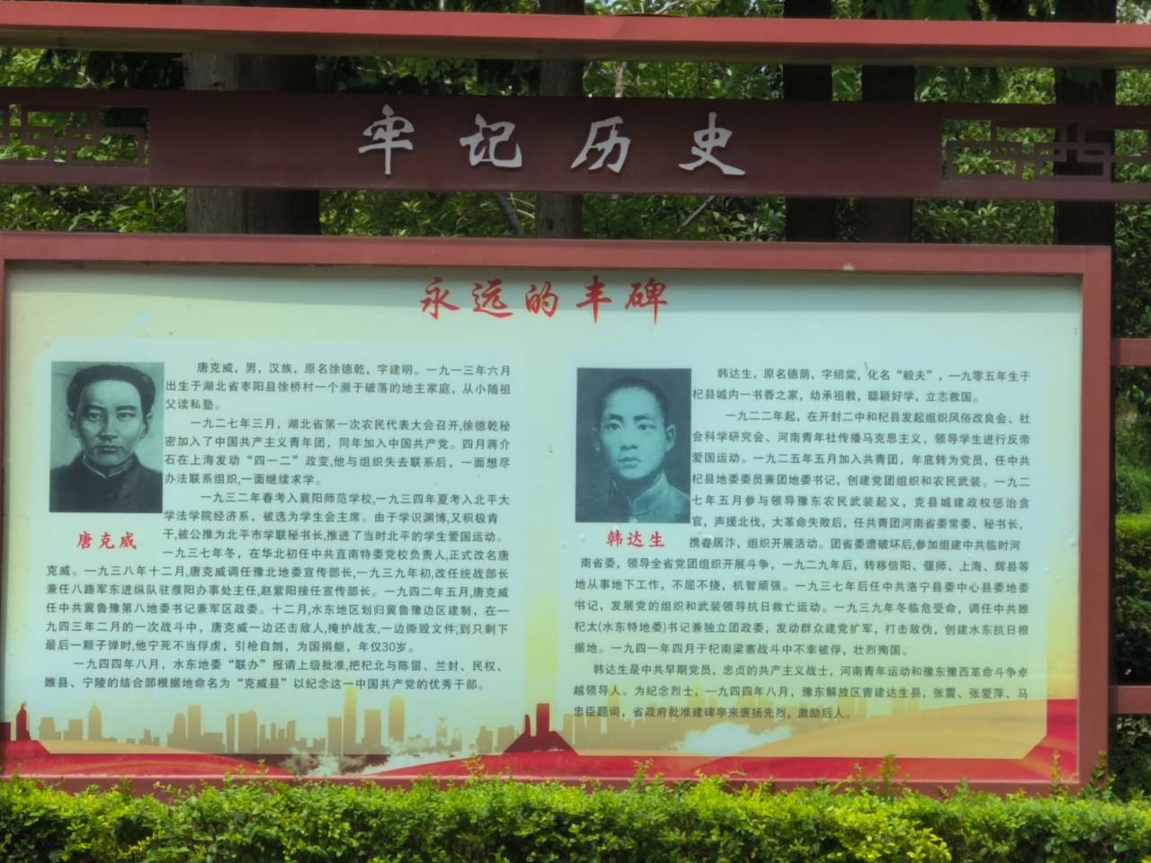 1987年4月,经省人民政府批准在杞县重建“水东烈士陵园”。1987年5月,中共中央政治局原委员、中央军委总参谋长杨得志、中央纪律检查委员会原书记王从吾分别为唐克威纪念碑题词。1998年5月,中央军委原副主席张震上将、国防部原部长张爱萍上将分别为韩达生纪念碑题词。
