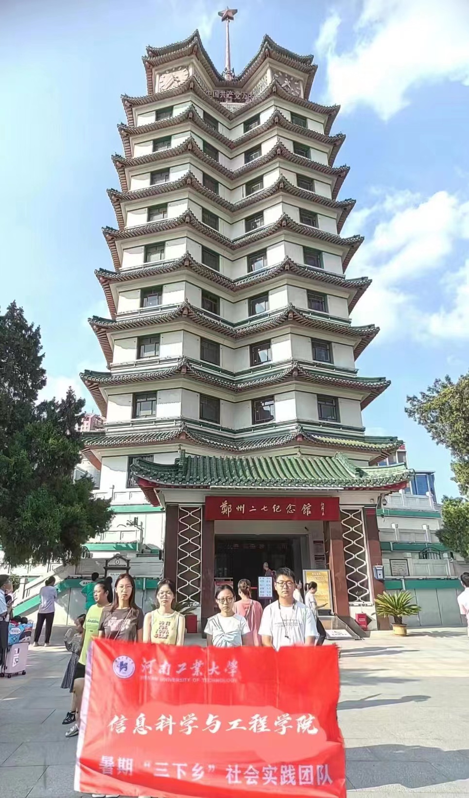 泱泱华夏,万古精魂,如日之升,如月之恒。河南工业大学信息科学与技术学院“信院红领巾”实践六人小组于2023年8月29日上午九点三十分出发前往二七纪念塔进行参观历史遗迹,学习铁路精神,传播红色文化。从晨光熹微到烈日当空,从粼粼莲湖到辉辉二七塔,实践小队充分践行知行合一理念,真正做到学好二七历史,讲好铁路精神。