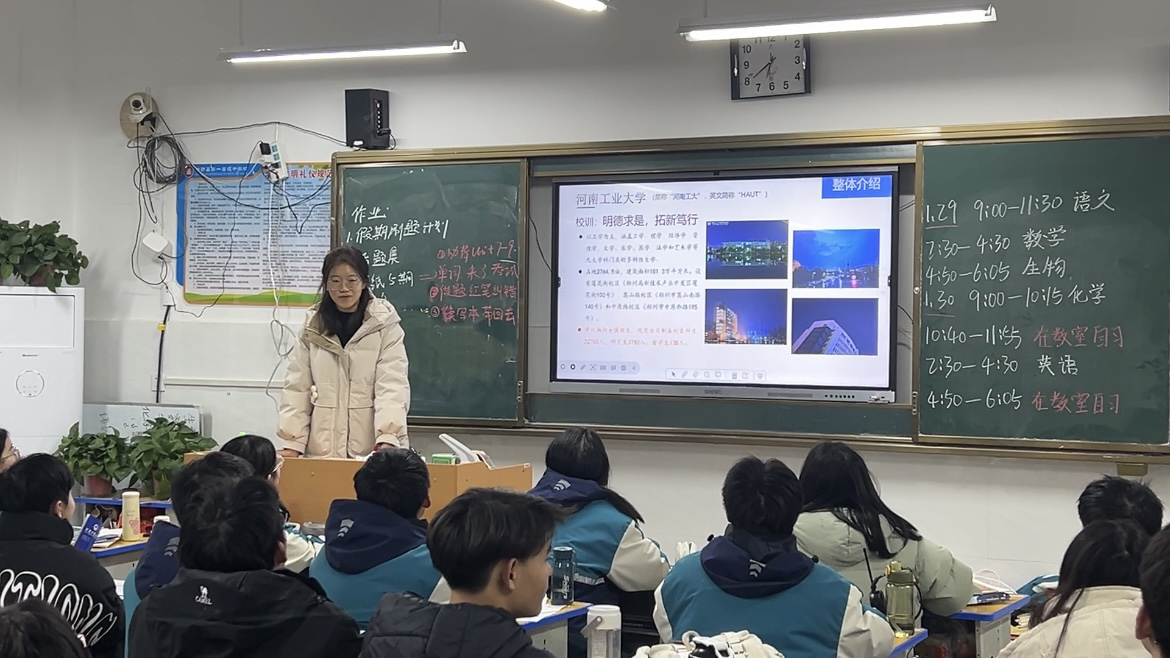 。同时,对学校的奖励资助政策、招生计划等进行详细介绍。在PPT的展示下,同学们看到了河南工业大学的教学楼、图书馆、宿舍、餐厅等设施,了解到学校的师资力量、学院设置等信息。