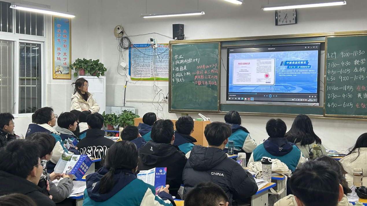 “返家乡”社会实践团队成员王小彤同学携带我校招生宣传物品赴河南省南阳市新野县第一高级中学校一年级(30)班开展招生宣讲活动,向母校学子宣传河南工业大学的校园环境、师资力量、办学条件等,同时与学弟学妹分享个人学习经验和学习方法。宣讲整体分为大学介绍、经验分享和互动问答三个环节。