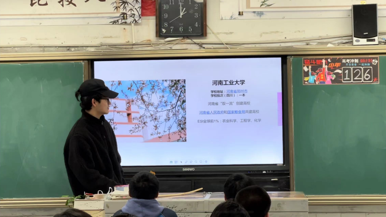 “返家乡”社会实践团队Elden成员刘嘉骏在寒假期间,重回母校自贡市第一中学校,宣讲大学生活,向母校高三学子介绍河南工业大学的师资条件,校园风光,以此开展招生宣讲。