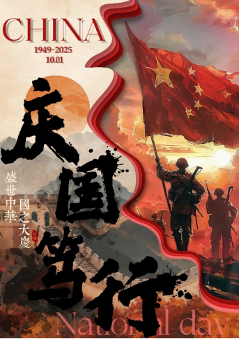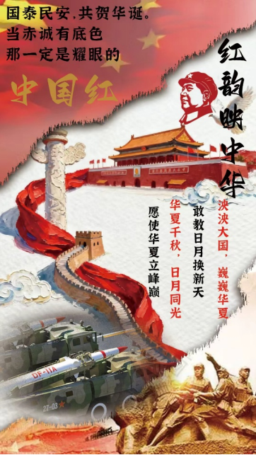 《国庆笃行》将太阳下祖国的壮丽山河与高举五星红旗的解放军背影融合,传递出对国家辉煌成就的礼赞与继往开来的坚定信念。《盛世华诞,举国同庆》将歌颂的对象转向了创造和守护社会的平凡劳动者。他们的身影与国旗融为一体,寓意着国家的荣耀正是由亿万普通劳动者的汗水与奉献铸就。《红韵映中华》将抗战历史和现代国防先进武器结合,红色建筑之上伟人遥望,彰显现代国家实力,映衬盛世中华!