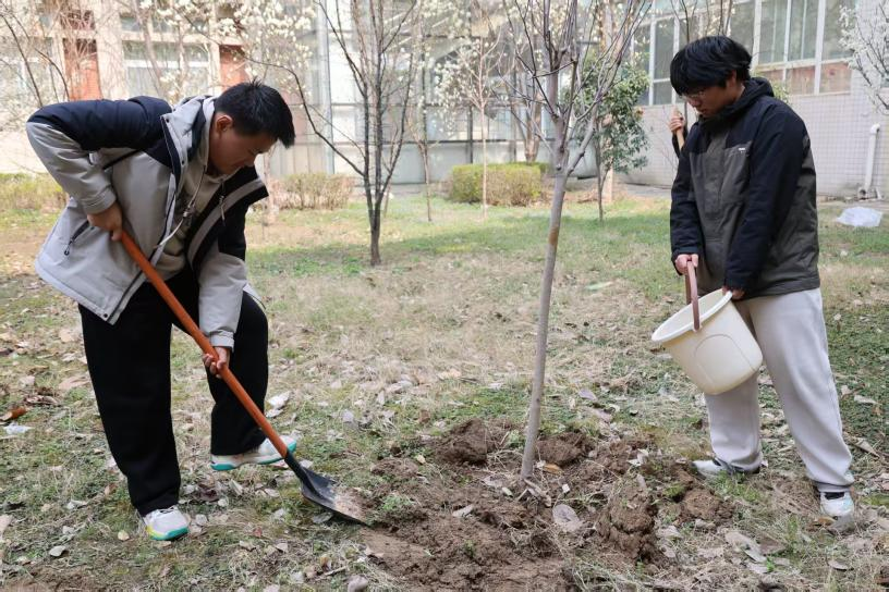 本次活动以“播种绿色希望,共建生态文明”为主题,旨在引导青年学子树立生态保护意识,践行劳动育人精神。活动前期,学院提前统筹规划、细致筹备,为植树活动顺利推进奠定坚实基础。志愿者们在活动中协同配合,大家共同松土扶苗,完成施肥、修剪枝叶、引水灌溉等一系列工序,用汗水浇灌新苗,用行动传递绿色希望,现场氛围热情高涨。