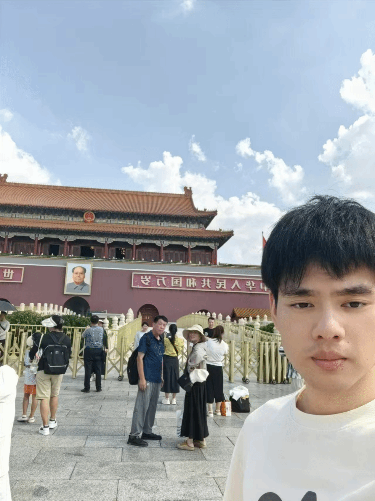 8月10上午10时,队伍代表参观天安门,用线上线下相结合的方式,其余队员进行云参观、云打卡。在广场上,雄伟的天安门城楼映入眼帘,我们不仅为它的宏伟而感叹,更为它的历史意义所感叹。天安门是中国历史上重要的政治和文化中心,见证了多个重大历史事件,如辛亥革命、五四运动和新中国的成立。它是国家历史的缩影,凝聚着无数人的奋斗与牺牲。站在天安门前,每一个中国人都会感受到一种强烈的爱国情怀,激励着人们为国家的繁荣富强而努力奋斗。