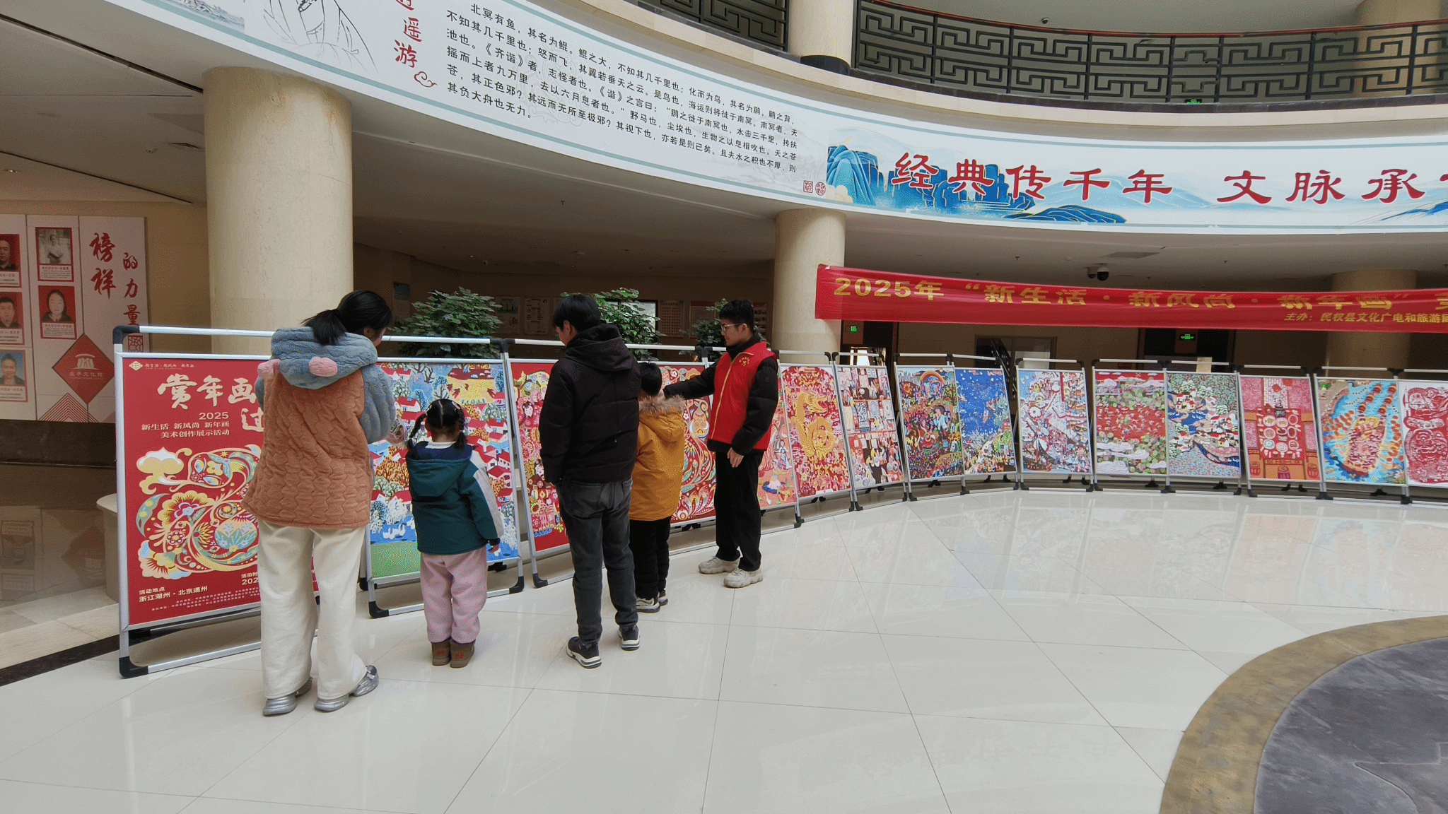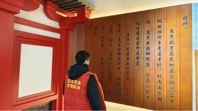随后,队员们又来到展览大厅,为游客讲解由民权县文化广电和旅游局主办的 “新生活・新风尚・新年画”美术创作展示活动,以及2025年庄子文化系列图片展,其中包括《庄子其人》《螳螂捕蝉》等丰富内容。队员们细致的讲解让游客们更加深入地了解了这些展览的内涵,使他们沉浸在庄子文化的浓厚氛围中。