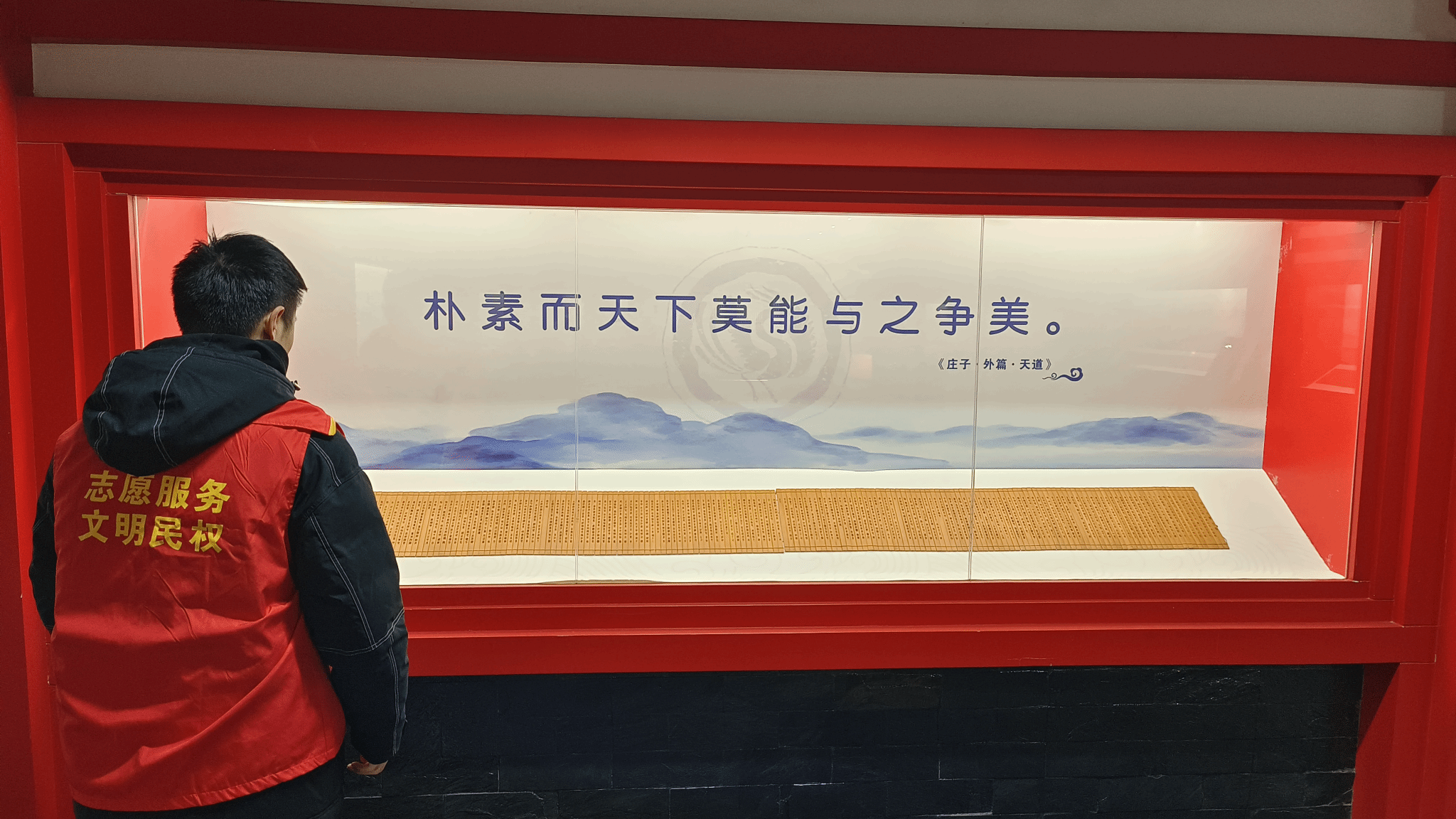 在另一个展柜旁,队员们介绍庄子的文章,并着重解读了名言“朴素而天下莫能与之争美”。他们向游客们传达庄子崇尚自然、追求本真的美学观念,引导游客思考现代社会中过度追求物质和外在美的现象。游客们在队员们的启发下,对庄子的美学思想有了新的感悟,不少人表示这种思考让他们受益匪浅。