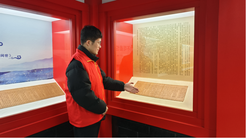 离开背景墙,队员们来到具体展柜前,专注地为游客讲解《庄子・内篇・养生主》。这篇文章蕴含着深刻的养生智慧与哲学内涵,队员们深知其难度,因此在讲解前做了大量功课。他们用通俗易懂的语言,结合生活中的实际例子,深入浅出地阐述其中的道理。“大家看,这里提到的‘庖丁解牛’,不仅仅是在说宰牛的技巧,更是告诉我们要顺应自然规律,这样才能在纷繁复杂的世界中保持内心的平静,达到养生的目的。”队员们的精彩讲解吸引了众多游客驻足聆听,大家纷纷点头表示赞同。