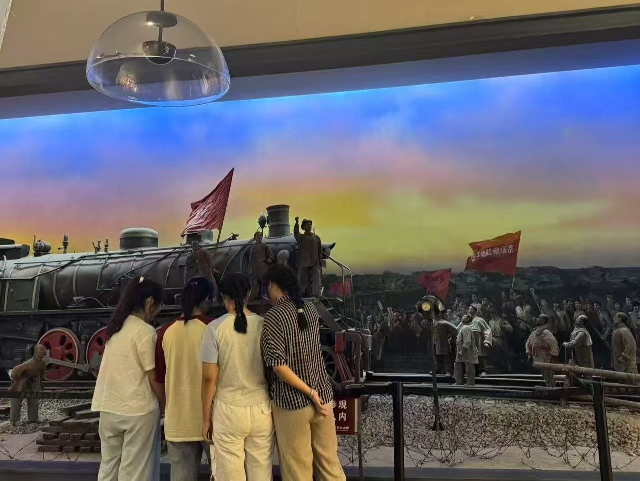 在京汉铁路大罢工的艺术场景前,四位队员被深深震撼。场景生动还原了当时工人罢工的激烈场面,仿佛能听到工人们的呐喊声。队员们看着场景中栩栩如生的人物形象,深刻体会到工人阶级在革命斗争中的无畏精神和强大力量。