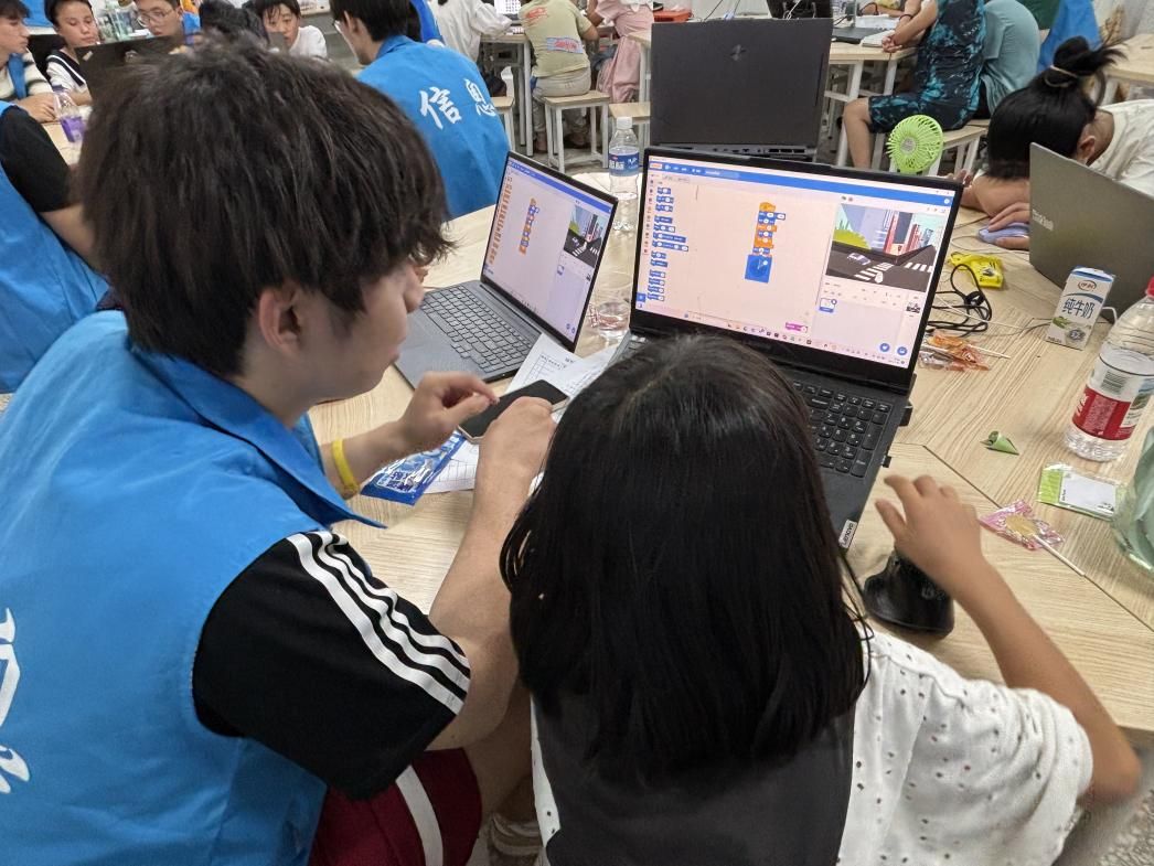 下午3时许,冠军小学的学生们陆续到校。考虑到天气炎热,团队提前准备了清凉贴和饮用水(图三)。起初学生较为腼腆,队员们便以抽签形式将学生分成小组。教学开始后,团队成员耐心引导学生熟悉编程环境,却发现部分学生因首次接触电脑,存在找不到鼠标指针等问题。针对这一情况,成员们先从鼠标使用及基础键位教学入手,再逐步推进编程内容。