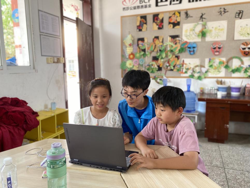 下午3时,团队开展了最后一天的编程教学课程。队员们耐心讲解代码逻辑与模块运用,引导小学生从“玩游戏”向“创游戏”跨越(图二)。课堂上,孩子们在队员的指导下成功写出简易游戏程序,眼中闪烁着探索的光芒,教室里的热烈氛围彰显着教学成果。课程尾声,队员们向每位学生赠送了印有寄语的明信片(每张均署上队员姓名)与手提袋(图三),以小小礼物传递对孩子们的期许。