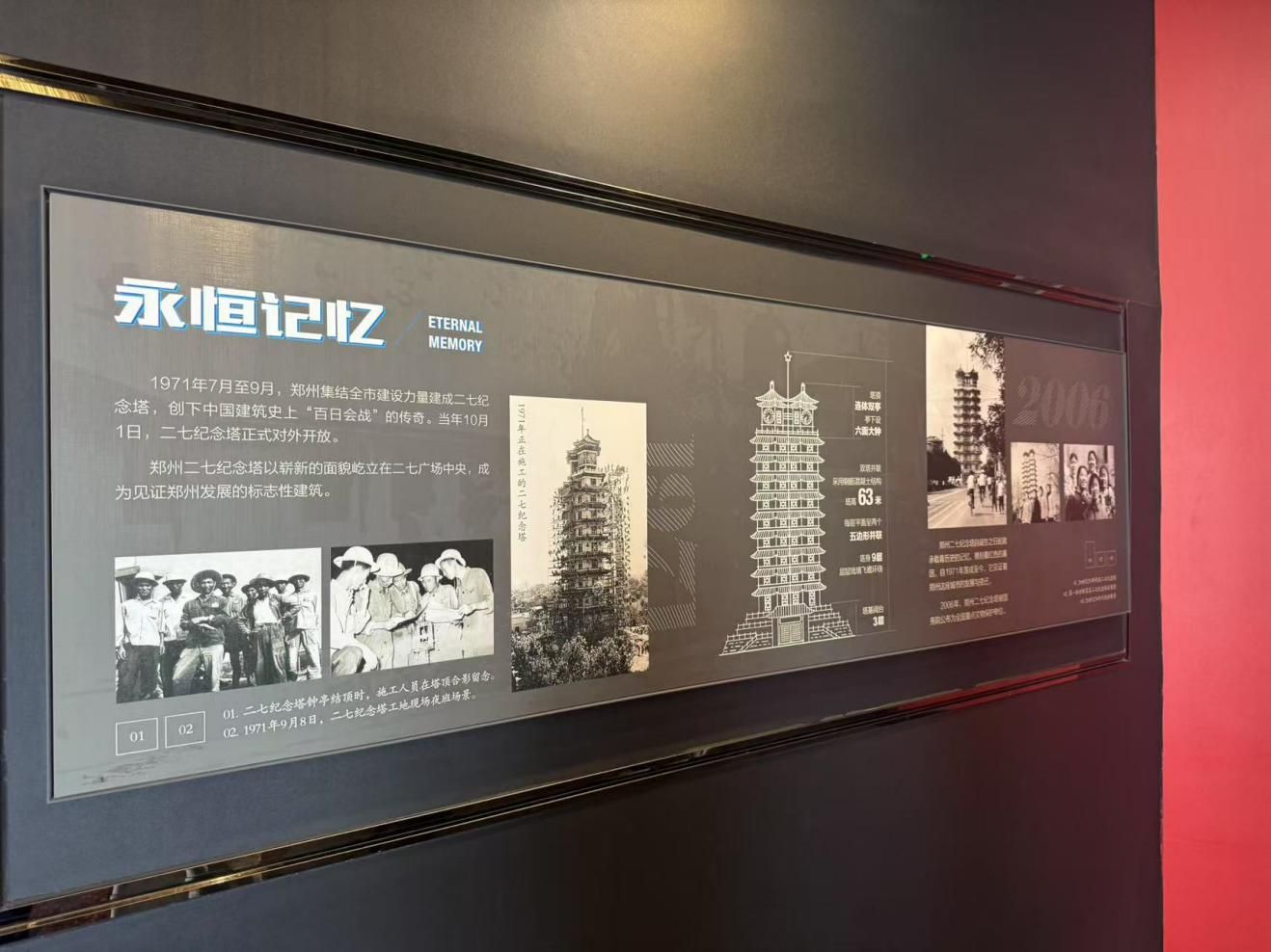 团队进去二七纪念塔进行参观,在二七纪念塔展厅有一个板块非常吸引,题目为“永恒记忆”。这个板块讲解了二七纪念塔的背景,1971 年 7 - 9 月,郑州建设者们以 “百日会战” 的拼搏,让纪念塔在二七广场拔地而起,10 月 1 日正式开放,成为郑州发展的见证者。看着展板上建设时工人合影、塔体建造场景,以及后续岁月里纪念塔的故事,仿佛能触摸到当年的火热干劲。这不仅是建筑奇迹,更是城市红色基因传承的具象,激励我们铭记历史,续写奋斗篇章。笔者着重了解到通过这次社会实践活动,队员们表示增加了他们对红色革命的认知、相信他们会在今后的生活中积极参与红色活动,发扬红色精神。