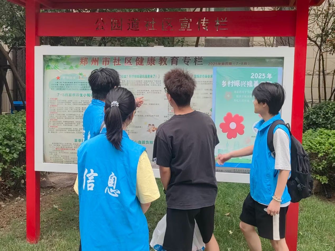 另一边,王满珂、申彦翔、张哲凡三位同学在社区广场开设“生活常识小课堂”,内容涵盖夏季防暑、垃圾分类、老年智能手机使用等方面。“夏天长时间在室外,要多喝淡盐水补充电解质,出现头晕恶心要及时到阴凉处休息。”王满珂同学的讲解通俗易懂,不少居民拿出手机记录要点;申彦翔、张哲凡针对居民提出的“快递盒属于哪类垃圾”“如何查询社保信息”等问题逐一解答,现场互动频繁。