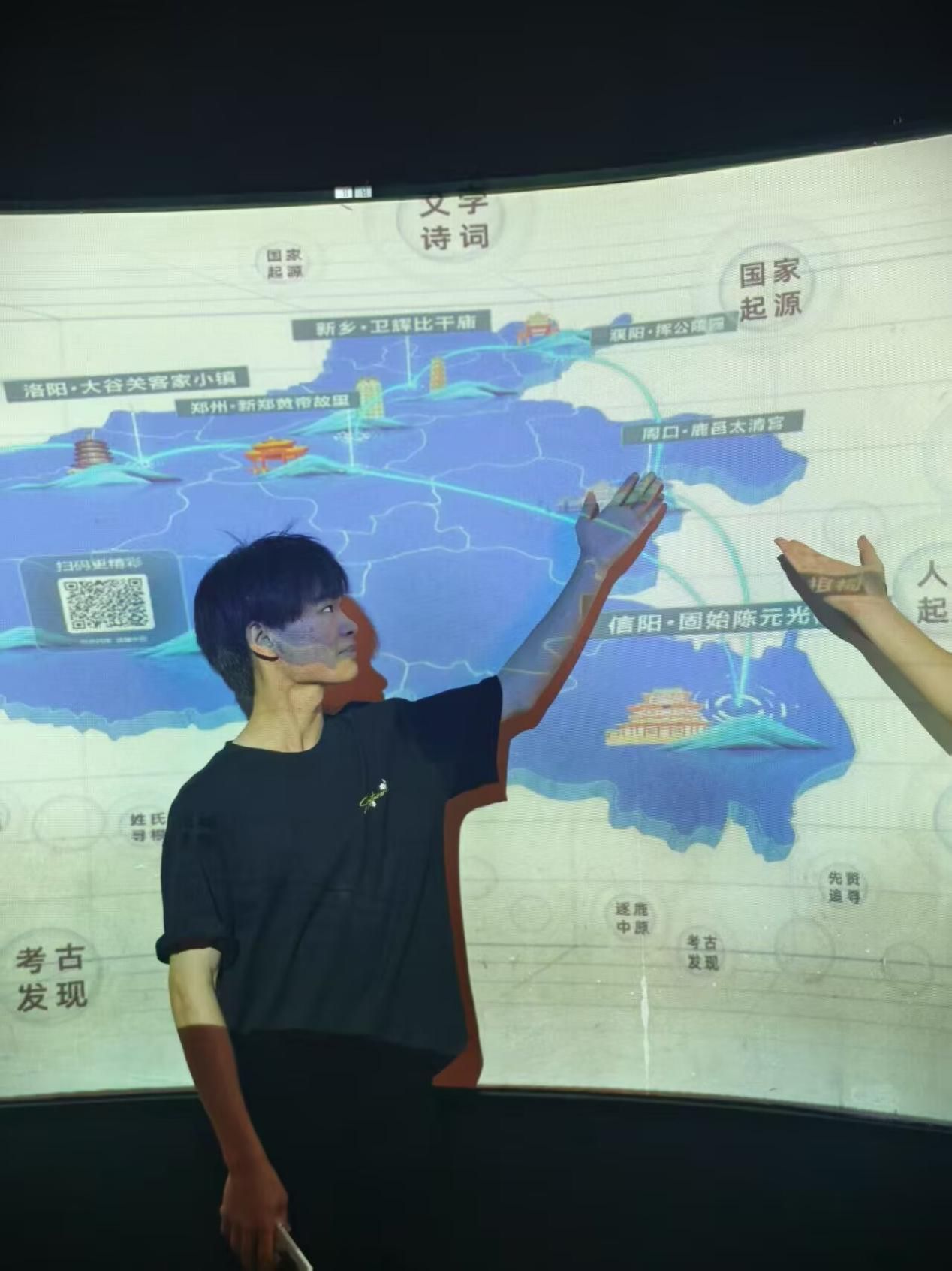 成员们在“河南文化地图”互动屏前,指尖滑动探寻“郑州·新郑黄帝故里”“周口·鹿邑太清宫”等文明起源地,通过AR技术“穿越”历史场景,解码“姓氏寻根”“考古发现”等文化基因,构建河南文化时空坐标系。
