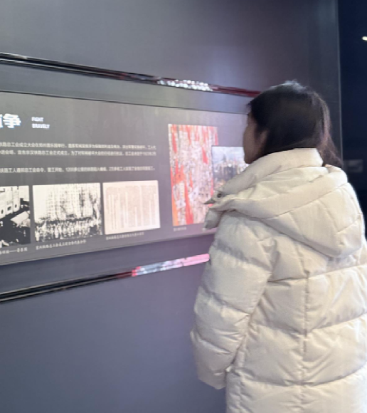 二七纪念塔巍然矗立,塔身十四层,象征“二七”罢工。队员们依次参观“铁路修建”“罢工爆发”“工人血书”“二七惨案”等展厅,塔内拾级而上,每一层都是一段沉重的记忆。队员们缓步绕行,指尖轻触展柜中百年前的铁轨铆钉,仿佛仍能感受到当年工人兄弟滚烫的脉搏;在“血书墙”前,大家不约而同放轻脚步,那用毛笔蘸血写下的“劳工神圣”四字,让原本嘈杂的参观通道瞬间安静,只余快门声与呼吸声交织;登至塔顶俯瞰二七广场,车流如织,繁华尽收眼底,队员们沉默良久——脚下的土地曾浸染工运先烈的热血,眼前的和平来之不易,红色精神在静默中完成了一次跨越时空的传递。一份份泛黄的《京汉铁路工人泣告全国书》、一幅幅“劳工神圣”标语的照片,把大家带回1923年2月7日那个血雨腥风的夜晚。“罢工工人宁死不屈,林祥谦烈士‘头可断,工不可复’的呐喊,让我真切体会到信仰的力量。”组长李紫欢在笔记中写道。
