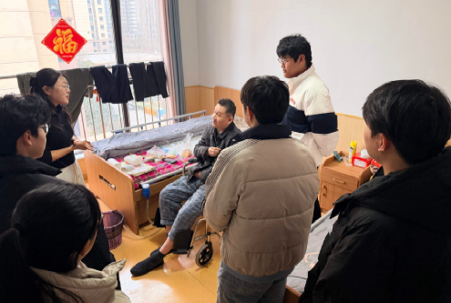 1 月 24 日的温情陪伴环节成为活动亮点。志愿者围坐老人身边,倾听他们讲述人生故事与生活趣事,同时分享校园点滴与社会热点,在亲切交流中拉近代际距离。志愿者还为老人捶背揉肩、陪同散步,活动尾声,大家手持院旗与老人们合影,定格温暖瞬间。