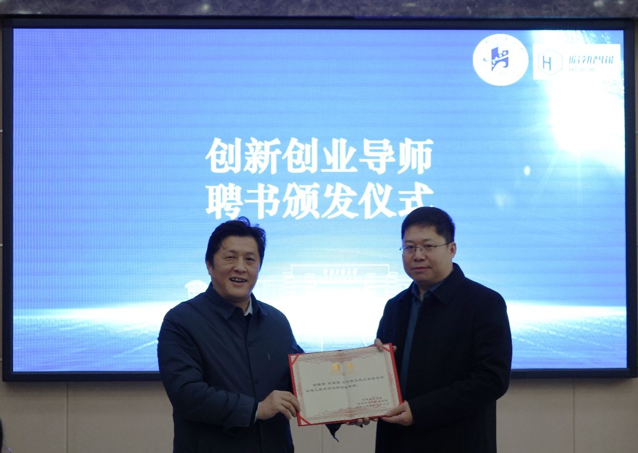 随后,郭晓旻代表学院为刘宪涛授予“创新创业基地”铭牌和“创新创业导师”聘书。